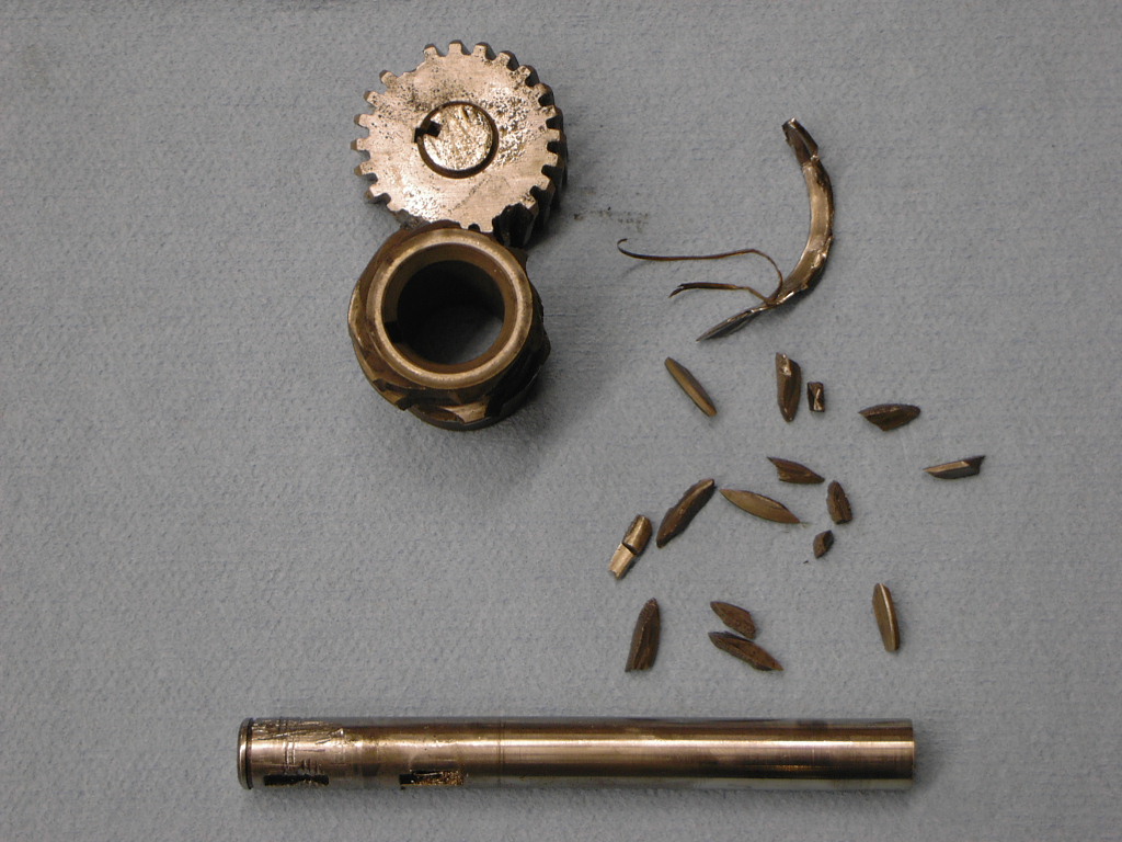 そこで、下の画像に注目してください。欠けたギアとその破片です。写真上のギアがエンジンの回転によって回されるオイルポンプのギアです。ギア中心近くに溝があります。同じくシャフト外側にも溝があります。この溝が同じ位置にあり、そこに回転防止のキーが差し込まれているのですが、見事にキーがねじれて溝の位置がずれてしまっています。こうなると、シャフトからギアが外れませんのでシャフトを切断して外しました。おまけにシャフト自体も曲がっており、このギア周りを外すのに半日かかってしまいました…
